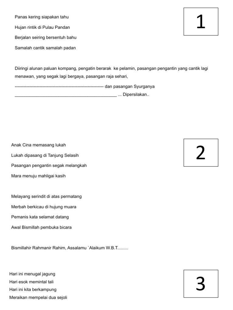 ......................Dengan rasa hormatnya, saya menjemput pasangan pengantin dan ahli keluarga untuk