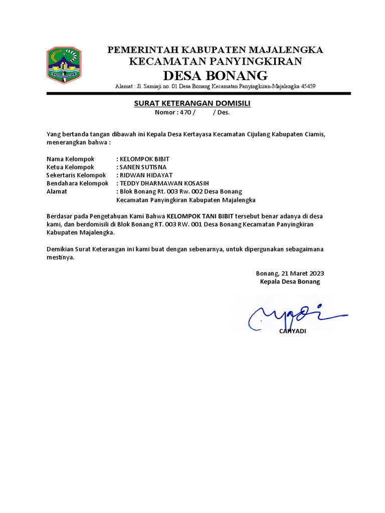kami, dan berdomisili di Blok Bonang RT. 003 RW. 001 Desa Bonang Kecamatan Panyingkiran