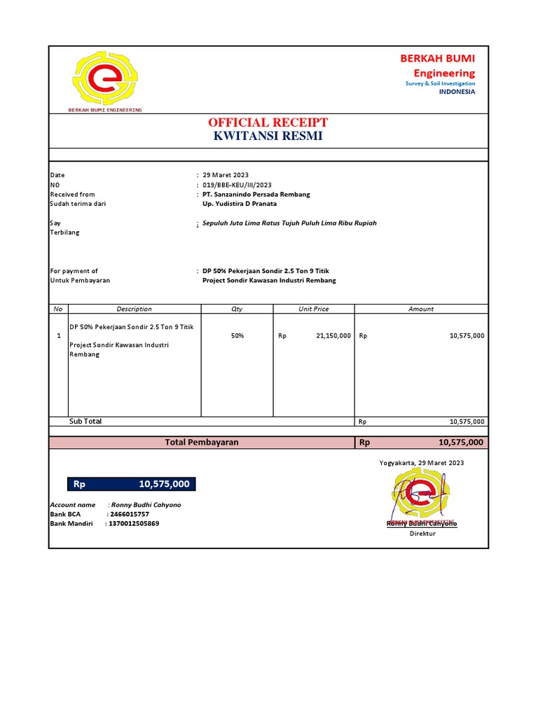 Untuk Pembayaran Project Sondir Kawasan Industri Rembang
