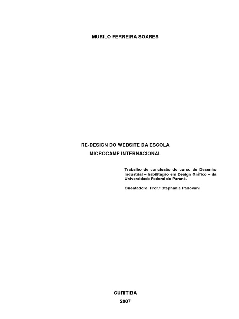 Ao longo dos anos a Internet vem se tornando cada vez mais uma ferramenta fundamental para a divulgao de servios e produtos de empresas que buscam conquistar o mercado com rapidez e eficcia. No entanto, nessa busca desenfreada pela conquista de seu espao na rede, muitas empresas, tais como a escola Microcamp, optaram por criar seus prprios sites sem o conhecimento necessrio e deixaram a desejar colocando no ar sites com pouco contedo ou precrios que no contribuem muito para a conquista de novos clientes. Nesse trabalho buscamos mostrar que o papel do designer fundamental na criao de sites, pois com o entendimento adequado e multidisciplinar possvel aplicar conceitos que favorecem o visual e a interatividade dos sites, contribuindo dessa forma para um melhor aproveitamento dos espaos na rede. Com o levantamento dos principais problemas atravs de listas heursticas e pesquisas junto aos usurios, pudemos definir os pontos a serem trabalhados e redesenhados. Seguindo o modelo de GARRET (2003) para o desenvolvimento de sites, alm do emprego de conceitos de usabilidade, e-Learning e arquitetura da informao, buscamos propor melhorias funcionais e estticas para o site da escola. Como resultado apresentamos uma interface mais limpa, concisa, coerente e funcional que contribuir para a divulgao dos produtos e servios da escola e que apresenta alternativas de interatividade e desenvolvimento pessoal.