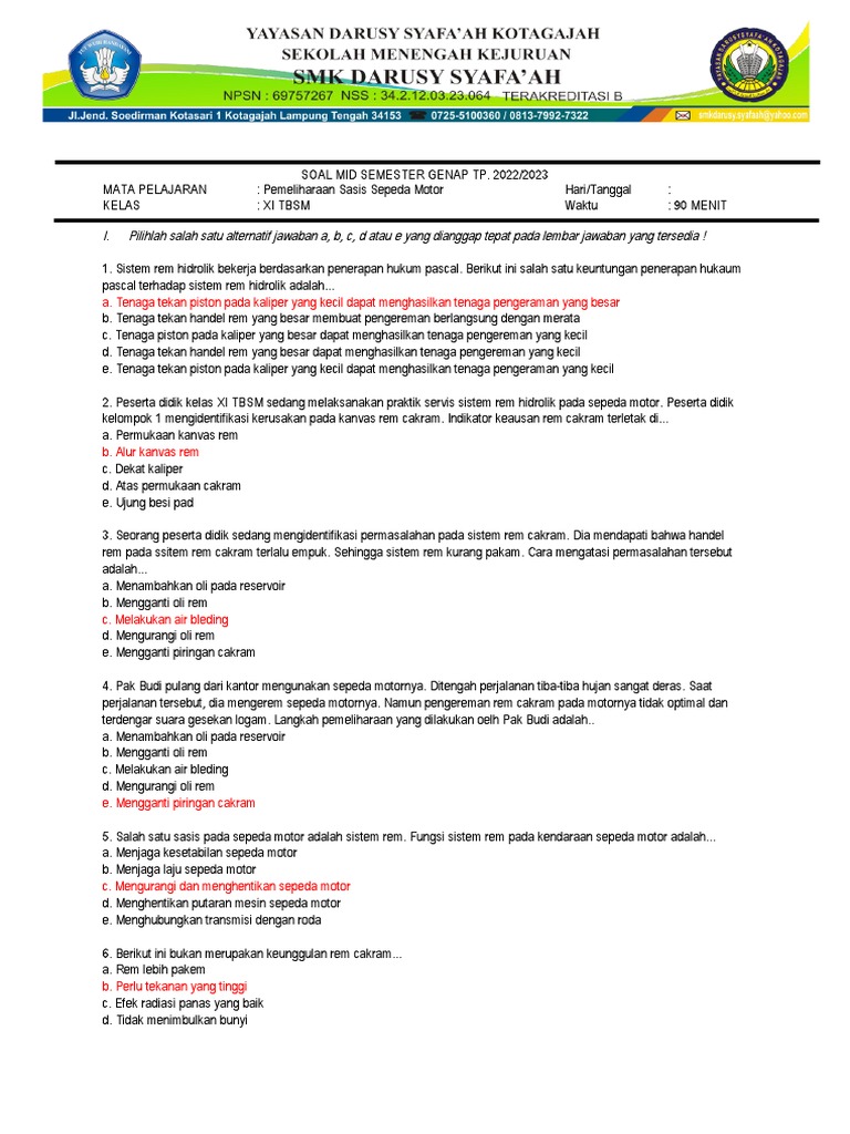 MATA PELAJARAN : Pemeliharaan Sasis Sepeda Motor Hari/Tanggal :