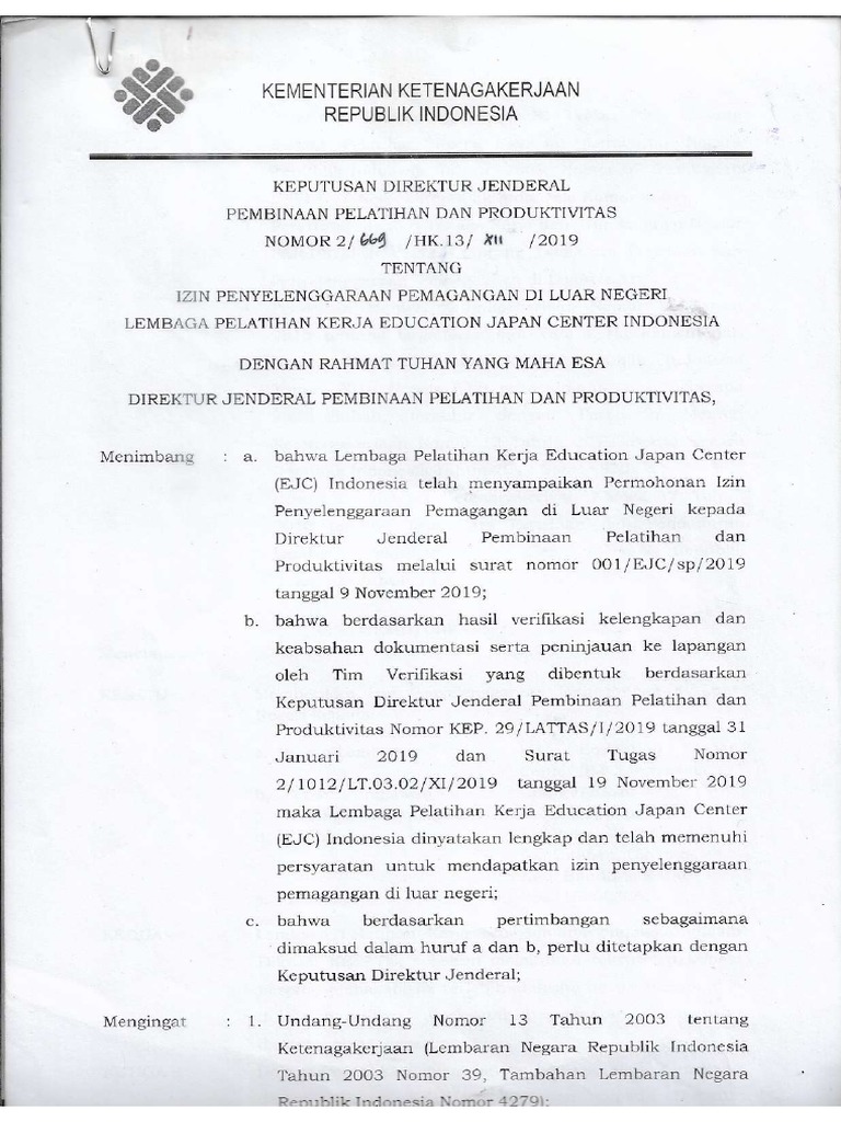 LEMBAGA PELATIHAN KERJA EDUCATION JAPAN CENTER INDONESIA