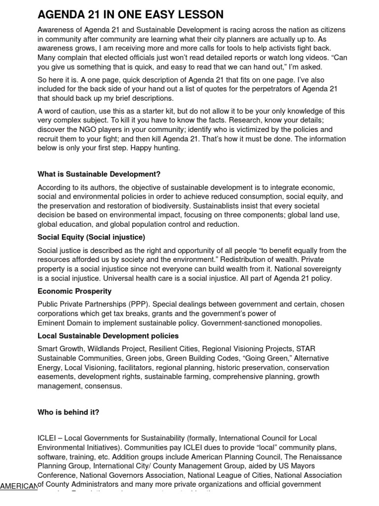 Awareness of Agenda 21 and Sustainable Development is racing across the nation as citizens in community after community are learning what their city planners are actually up to. As awareness grows, I am receiving more and more calls for tools to help activists fight back. Many complain that elected officials just wont read detailed reports or watch long videos. Can you give us something that is quick, and easy to read that we can hand out, Im asked. So here it is. A one page, quick description of Agenda 21 that fits on one page. Ive also included for the back side of your hand out a list of quotes for the perpetrators of Agenda 21 that should back up my brief descriptions. A word of caution, use this as a starter kit, but do not allow it to be your only knowledge of this very complex subject. To kill it you have to know the facts. Research, know your details; discover the NGO players in your community; identify who is victimized by the policies and recruit them to your fight; and then kill Agenda 21. Thats how it must be done. The information below is only your first step. Happy hunting.