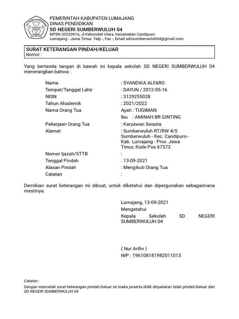 Dengan mencetak surat keterangan pindah/keluar ini maka peserta didik dinyatakan telah pindah/keluar dari