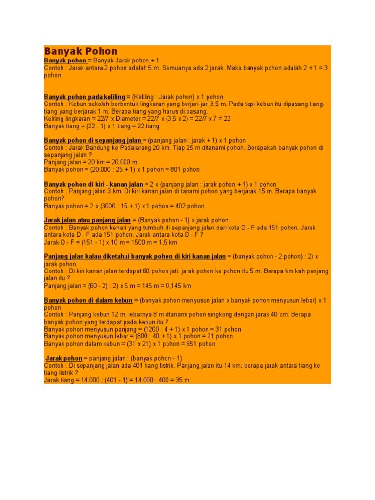 Contoh : Jarak antara 2 pohon adalah 5 m. Semuanya ada 2 jarak. Maka banyak pohon adalah 2 + 1 = 3