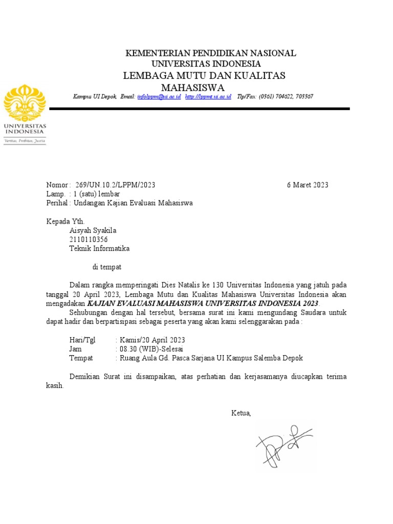 Perihal : Undangan Kajian Evaluasi Mahasiswa