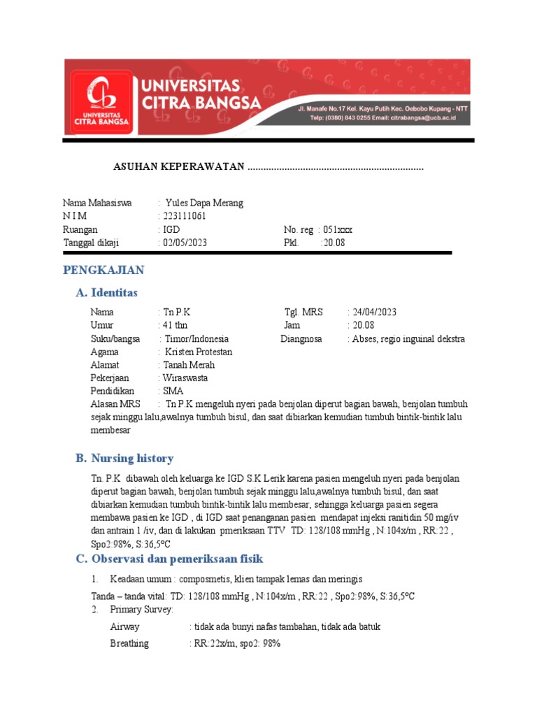Suku/bangsa : Timor/Indonesia Diangnosa : Abses, regio inguinal dekstra