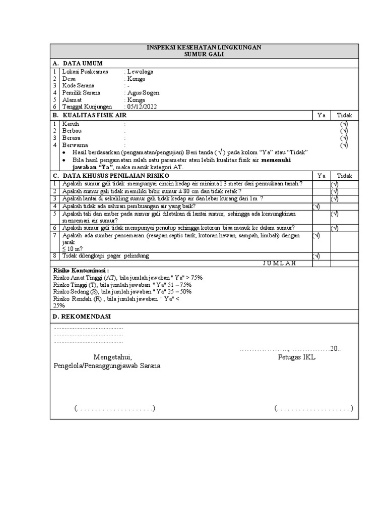 1 Apakah sumur gali tidak mempunyai cincin kedap air minima l 3 meter dari permukaan tanah ? (√)