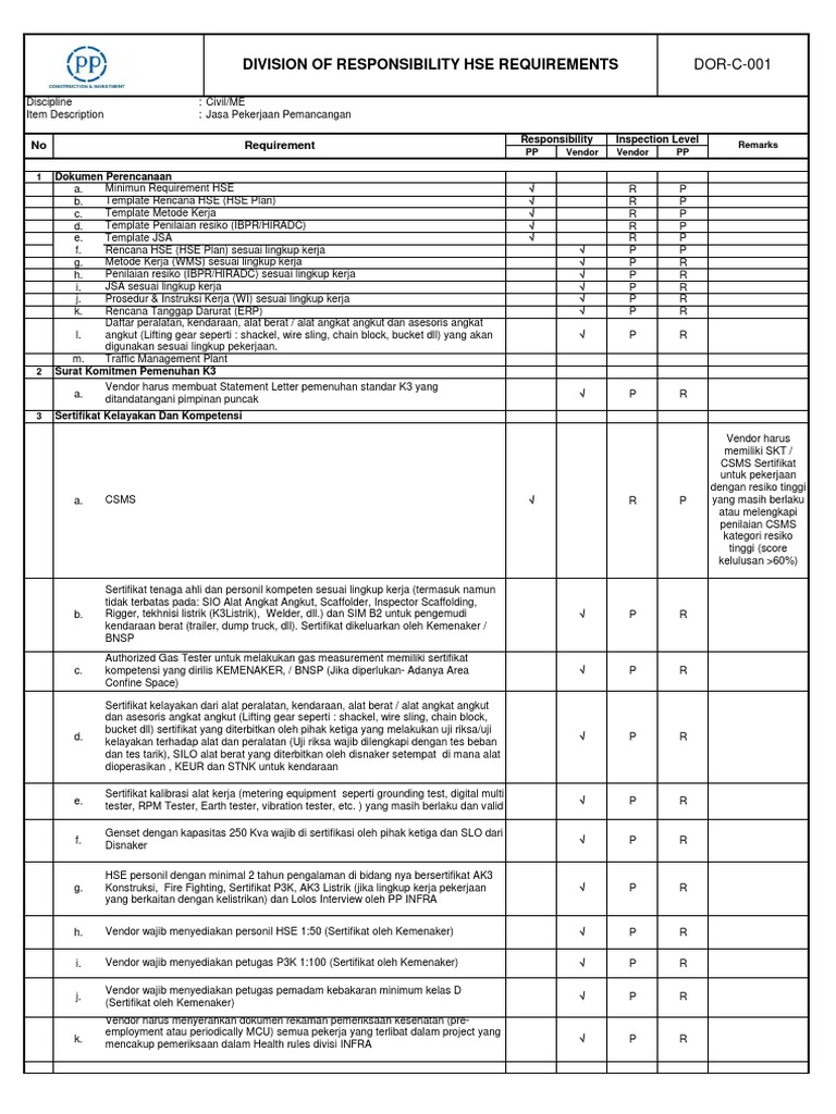 h. Vendor wajib menyediakan personil HSE 1:50 (Sertifikat oleh Kemenaker) √ P R