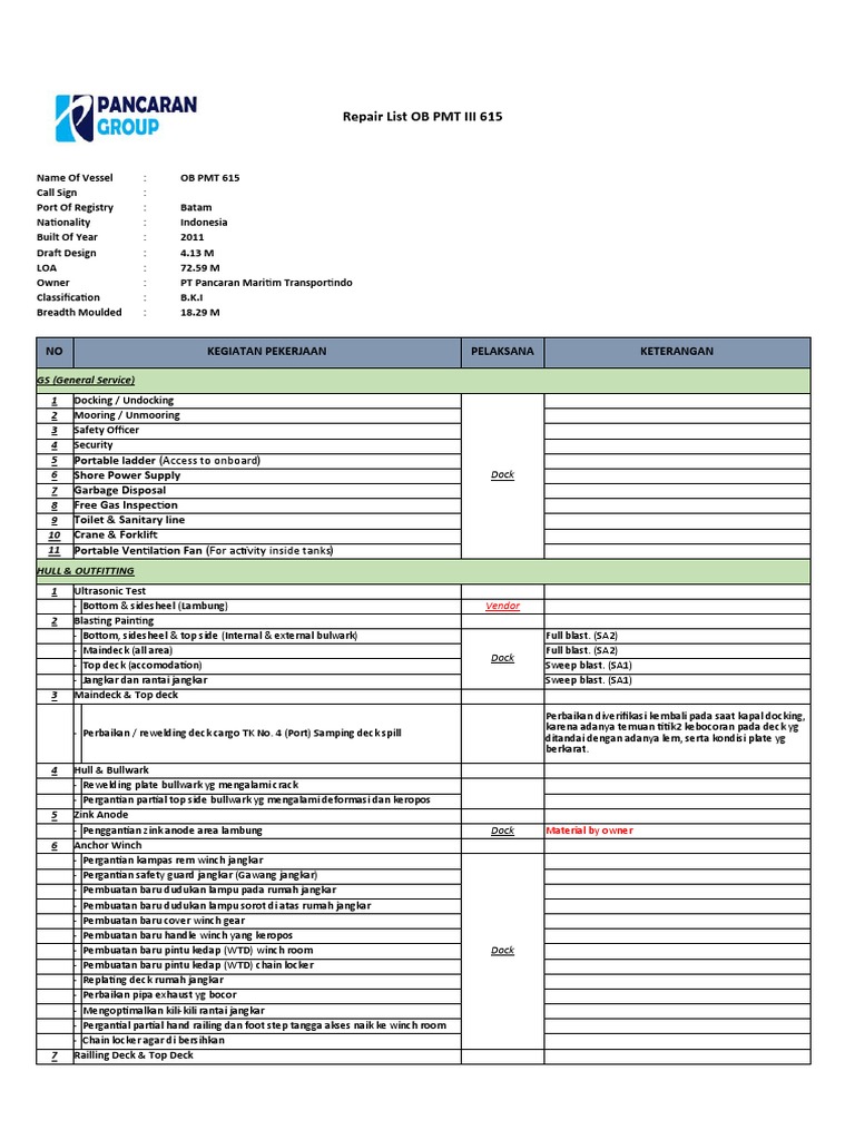 Demikian repair list yang telah dibuat sebagai acuan dalam kegiatan pekerjaan docking yg akan dilaksanakan.