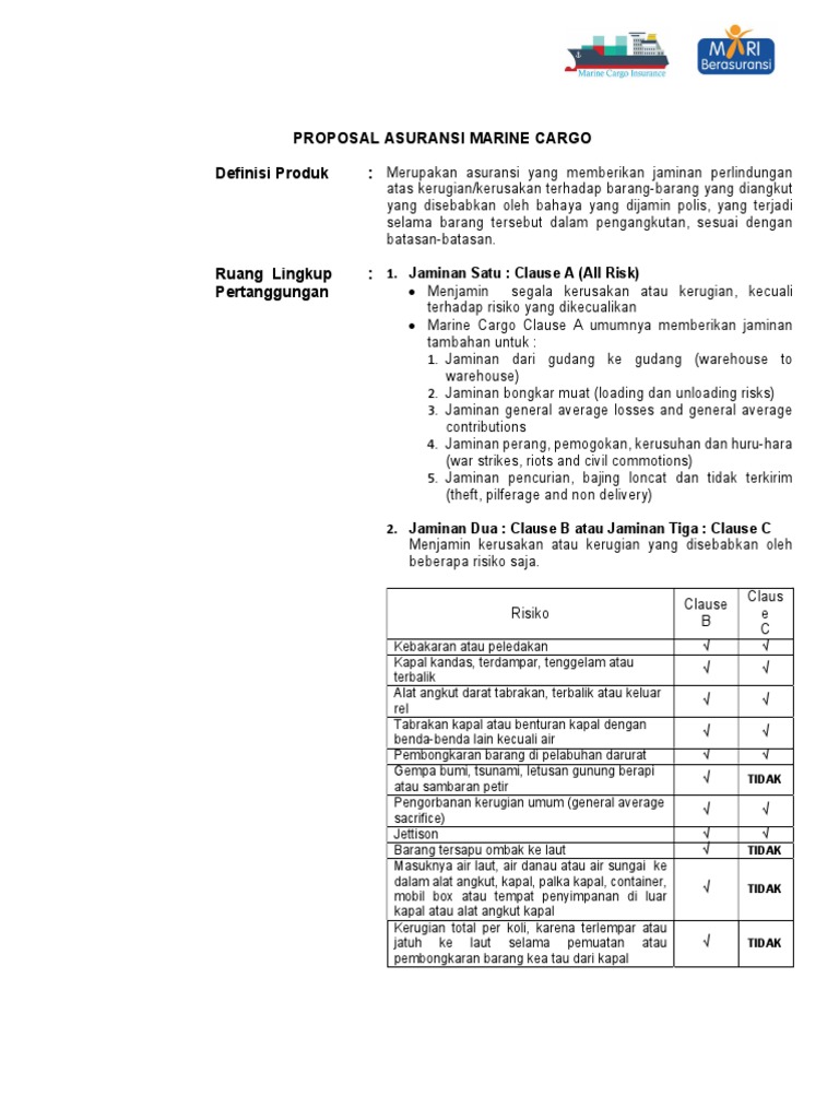 Ruang Lingkup : 1. Jaminan Satu : Clause A (All Risk)
