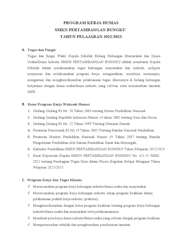 √ Merencanakan program kerja hubungan industri/dunia usaha dan masyarakat