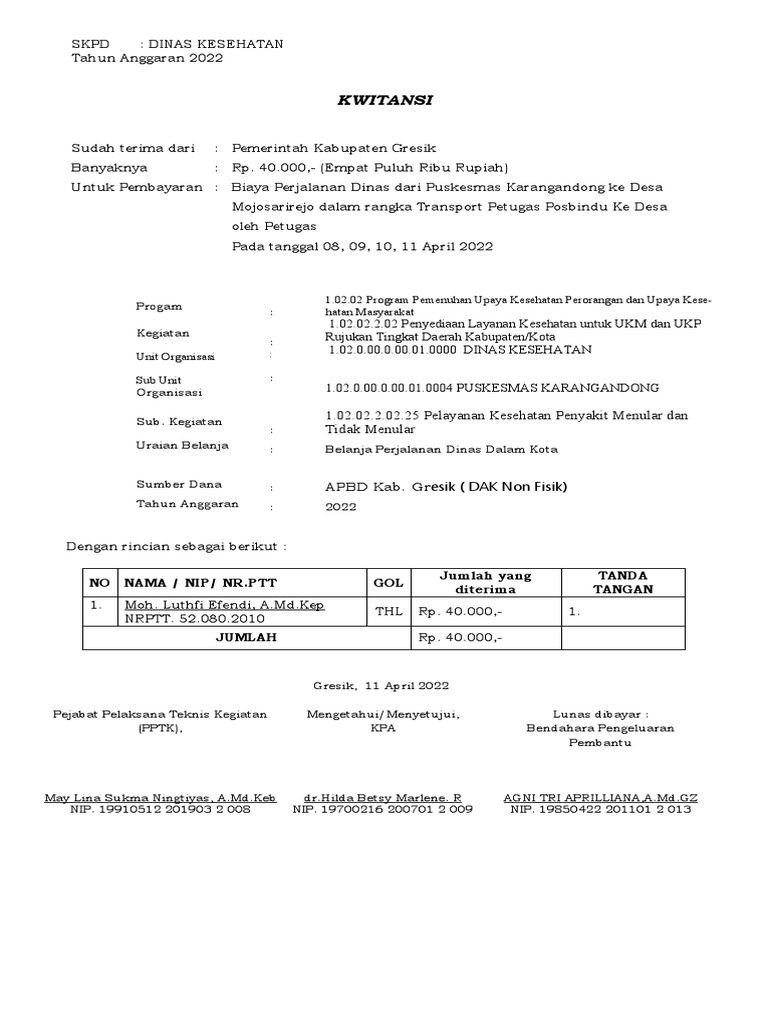 Untuk Pembayaran : Biaya Perjalanan Dinas dari Puskesmas Karangandong ke Desa