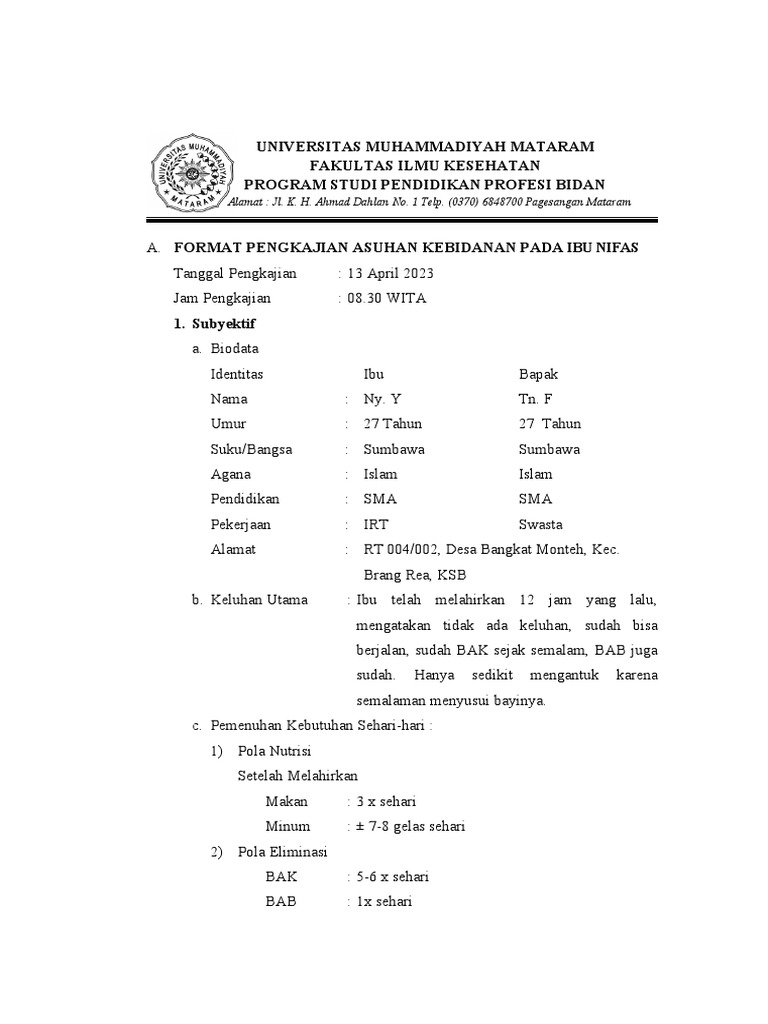 A. FORMAT PENGKAJIAN ASUHAN KEBIDANAN PADA IBU NIFAS