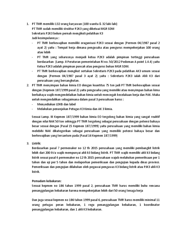 - PT TMR yang seharusnya menjadi ketua P2K3 adalah pimpinan tertinggi perusahaan