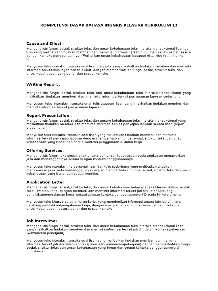 KOMPETENSI DASAR BAHASA INGGRIS KELAS XII KURIKULUM 13