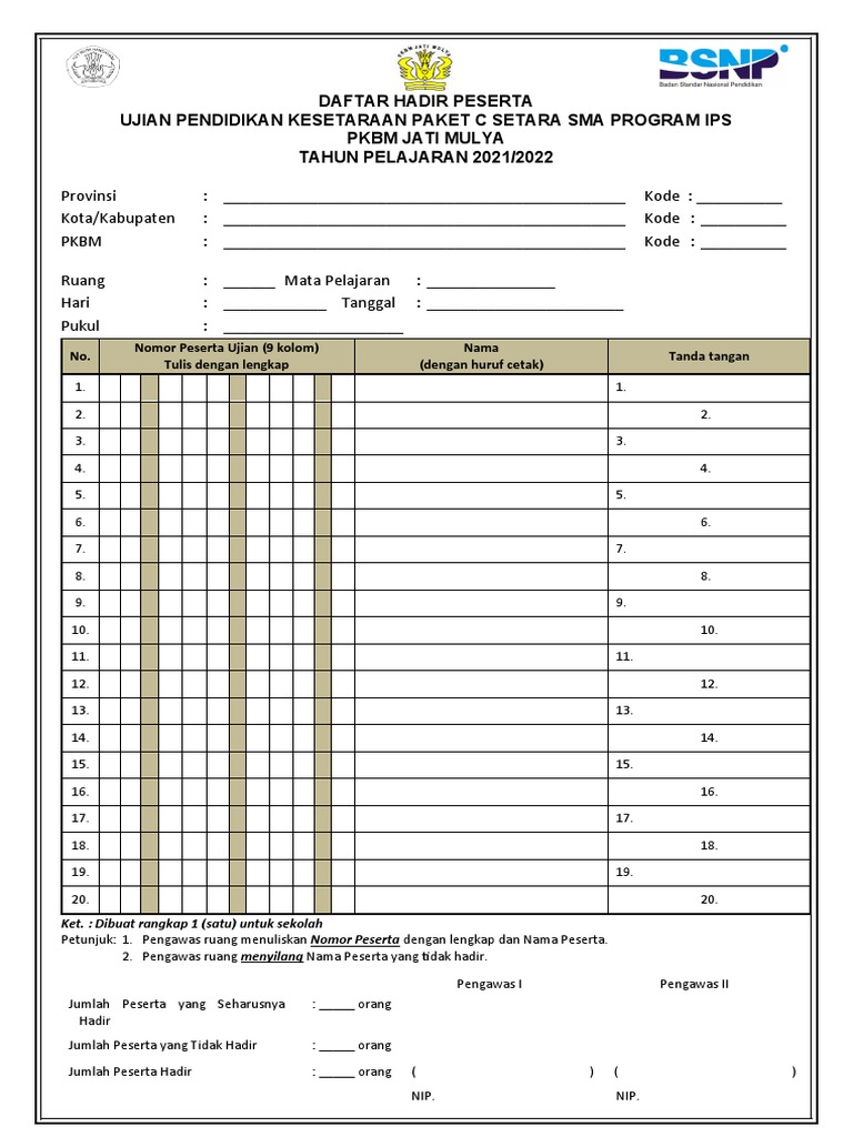 2. Pengawas ruang menyilang Nama Peserta yang tidak hadir.