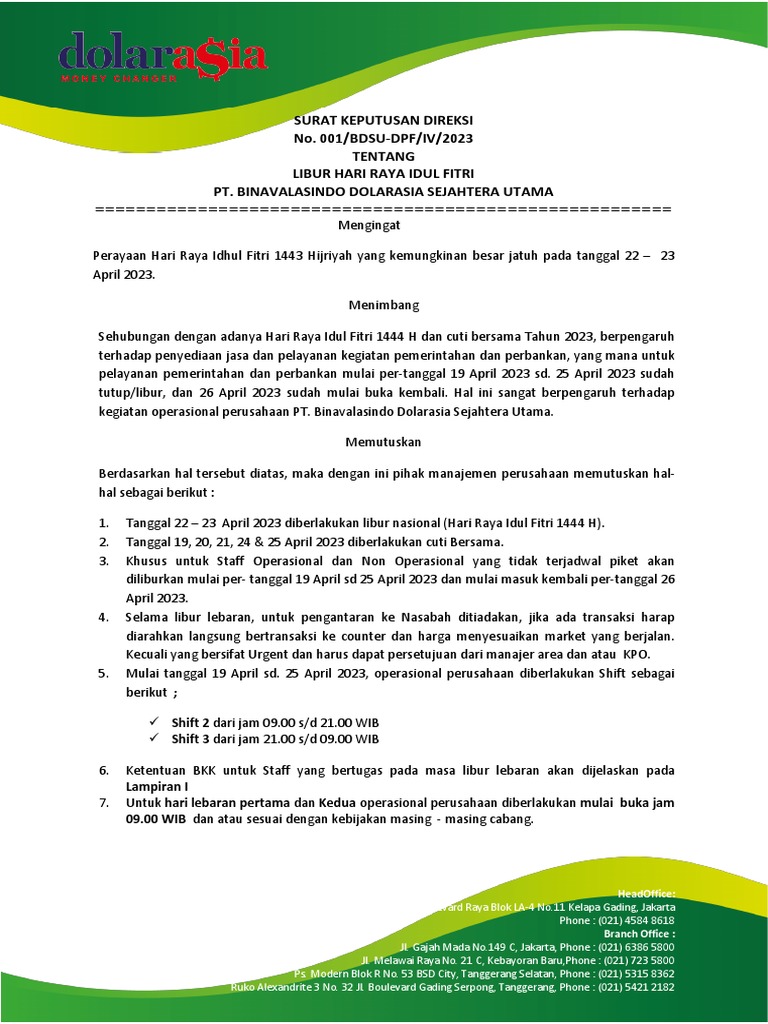 5. Mulai tanggal 19 April sd. 25 April 2023, operasional perusahaan diberlakukan Shift sebagai