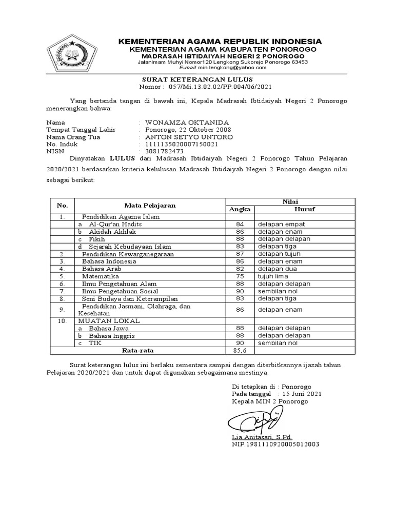 Dinyatakan LULUS dari Madrasah Ibtidaiyah Negeri 2 Ponorogo Tahun Pelajaran