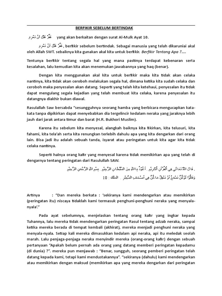 ِ فَقِّرْ قَ ْب َل اَ ْن تَع , berfikir sebelum bertindak. Sebagai manusia yang telah dikaruniai akal