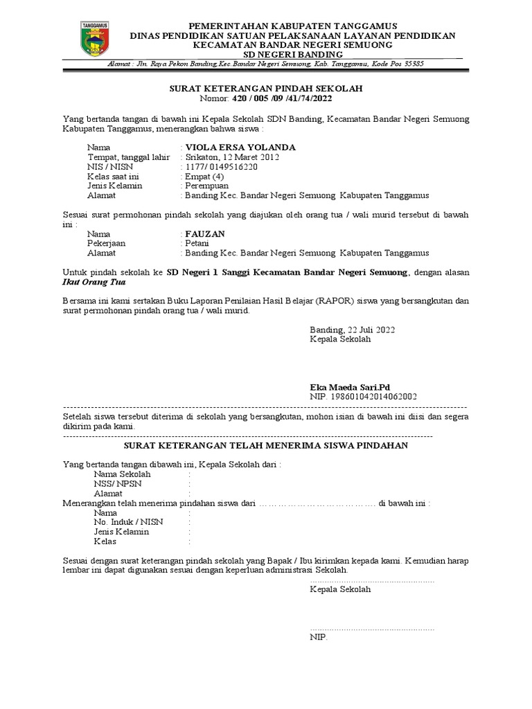 Untuk pindah sekolah ke SD Negeri 1 Sanggi Kecamatan Bandar Negeri Semuong, dengan alasan