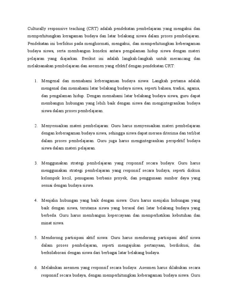 Culturally responsive teaching (CRT) adalah pendekatan pembelajaran yang mengakui dan