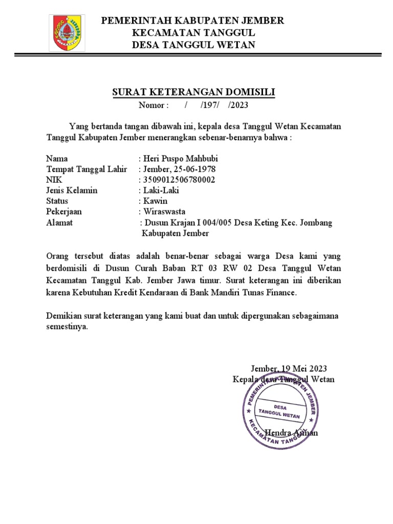 Kecamatan Tanggul Kab. Jember Jawa timur. Surat keterangan ini diberikan