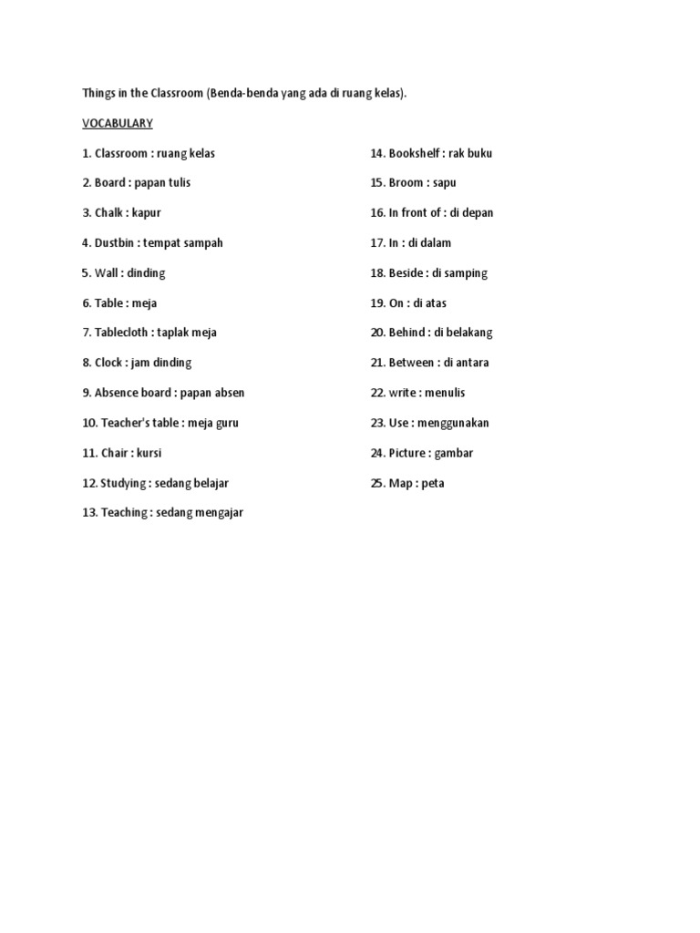 9. Absence board : papan absen 22. write : menulis