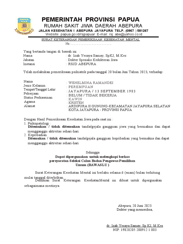 SURAT KETERANGAN PEMERIKSAAN KESEHATAN MENTAL