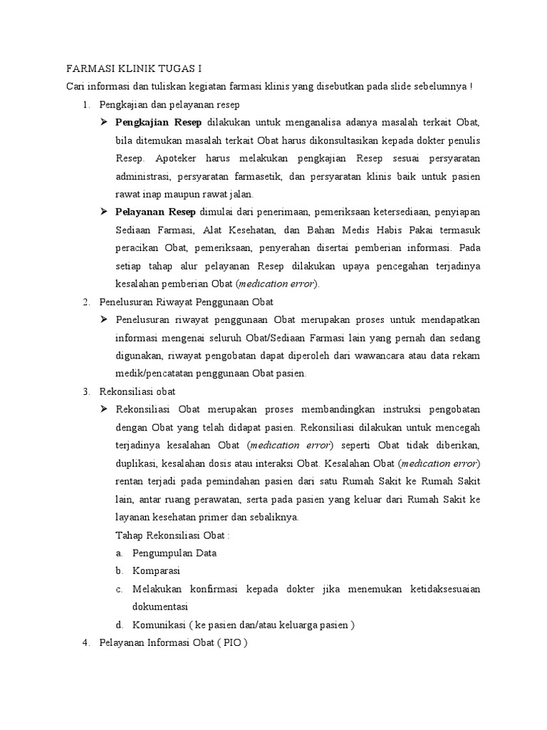 Cari informasi dan tuliskan kegiatan farmasi klinis yang disebutkan pada slide sebelumnya !