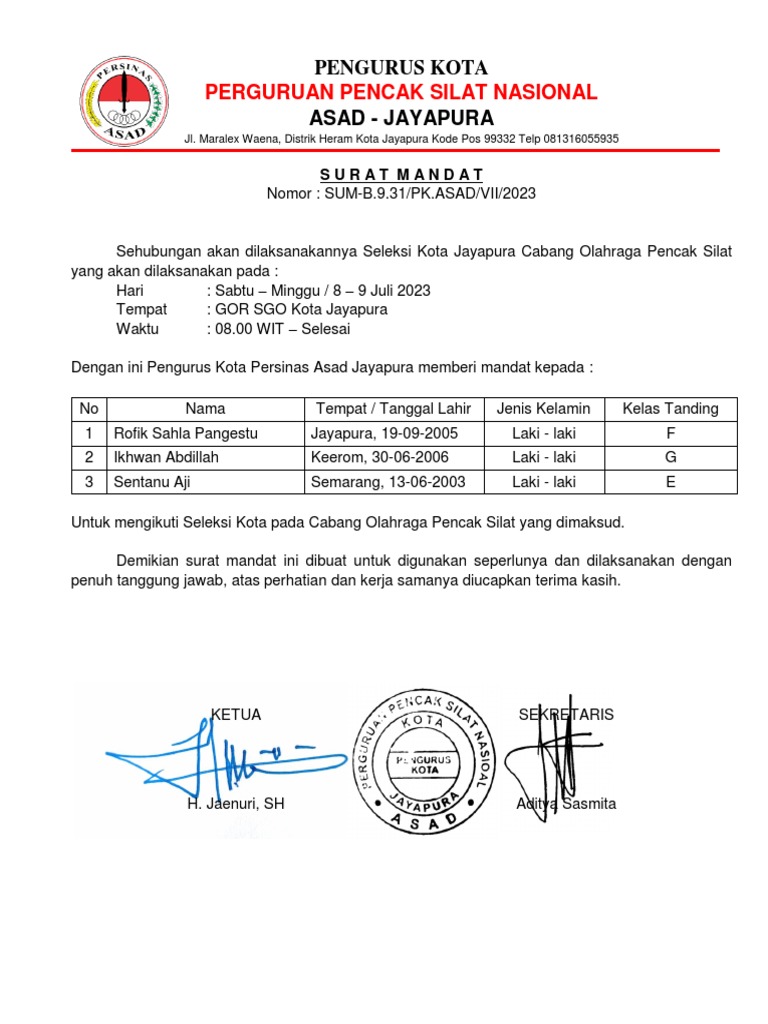 Dengan ini Pengurus Kota Persinas Asad Jayapura memberi mandat kepada :