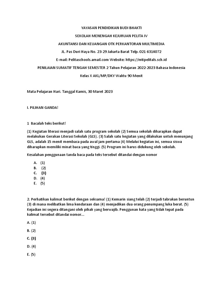 PENILAIAN SUMATIF TENGAH SEMESTER 2 Tahun Pelajaran 2022-2023 Bahasa Indonesia