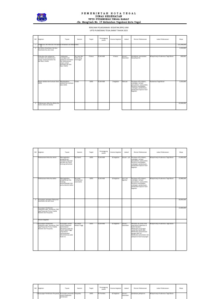 2 Kunjungan Pembinaan Posyandu Kunjungan posyandu Posyandu 100% PJ Promkes 60 kegiatan Januari - pendataan,pelaporan Wilayah kerja Puskesmas Tegal Barat