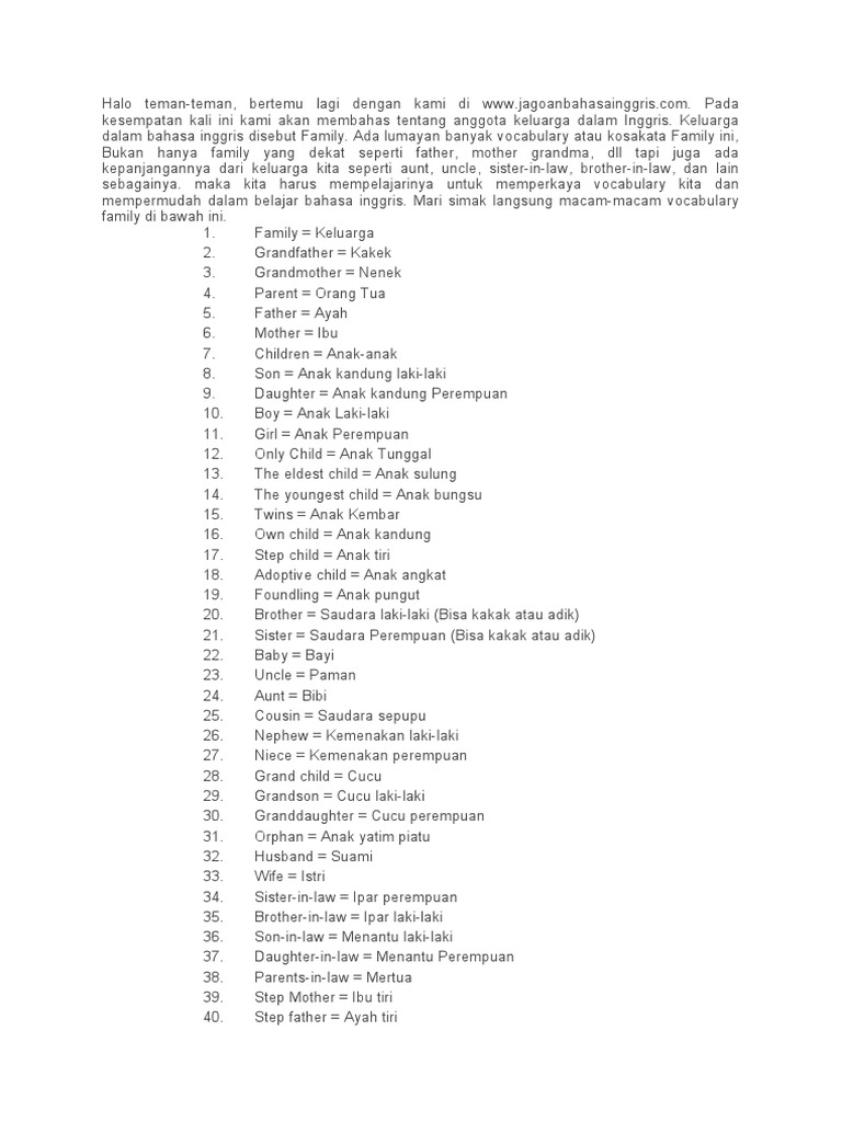 dalam bahasa inggris disebut Family. Ada lumayan banyak vocabulary atau kosakata Family ini,
