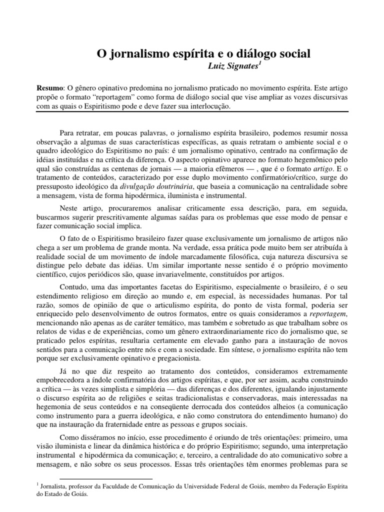 Resumo: O gnero opinativo predomina no jornalismo praticado no movimento esprita. Este artigo prope o formato reportagem como forma de dilogo social que vise ampliar as vozes discursivas com as quais o Espiritismo pode e deve fazer sua interlocuo.