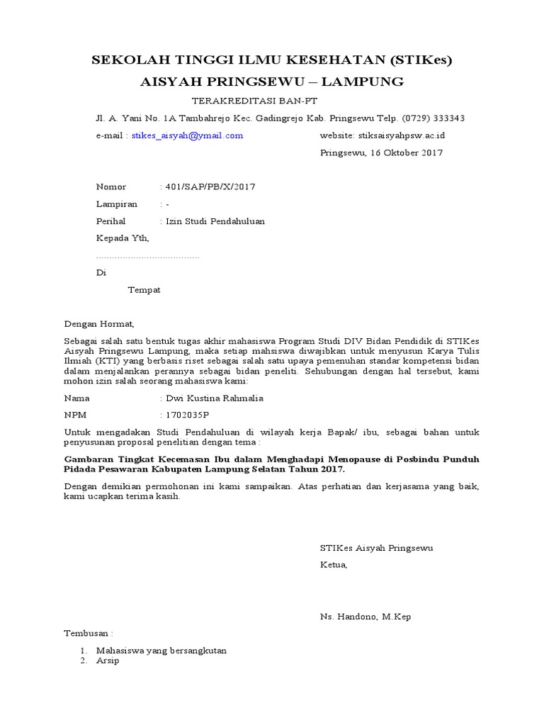 Untuk mengadakan Studi Pendahuluan di wilayah kerja Bapak/ ibu, sebagai bahan untuk