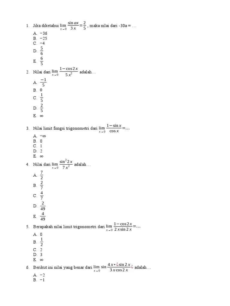 1. Jika diketahui lim = , maka nilai dari -30a = …
