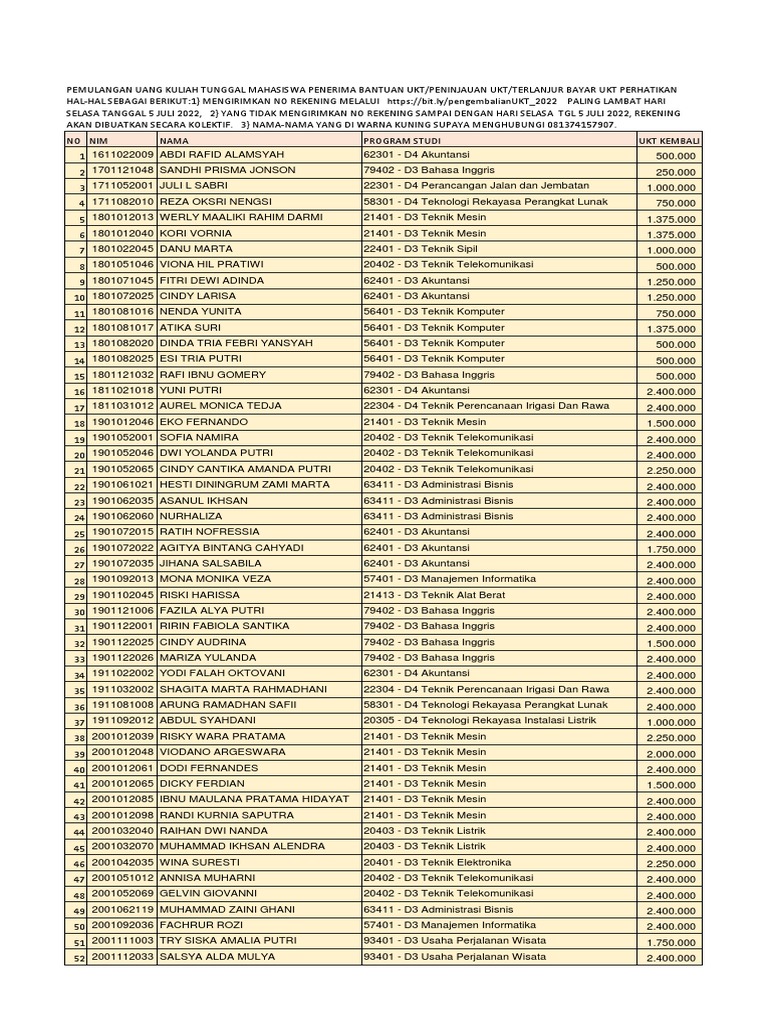 HAL-HAL SEBAGAI BERIKUT:1} MENGIRIMKAN NO REKENING MELALUI https://bit.ly/pengembalianUKT_2022 PALING LAMBAT HARI