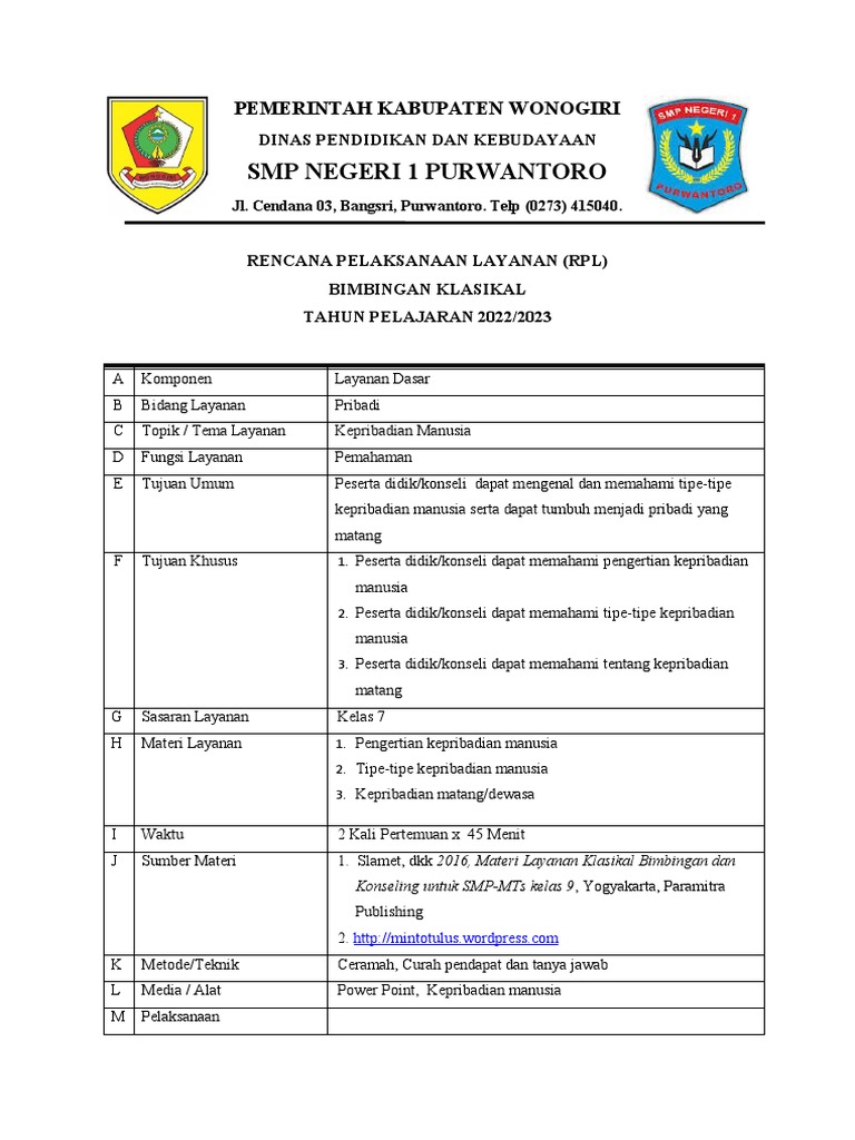 RENCANA PELAKSANAAN LAYANAN (RPL)