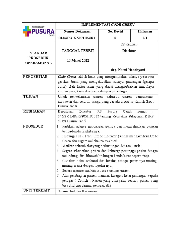 PENGERTIAN Code Green adalah kode yang mengumumkan adanya peristiwa