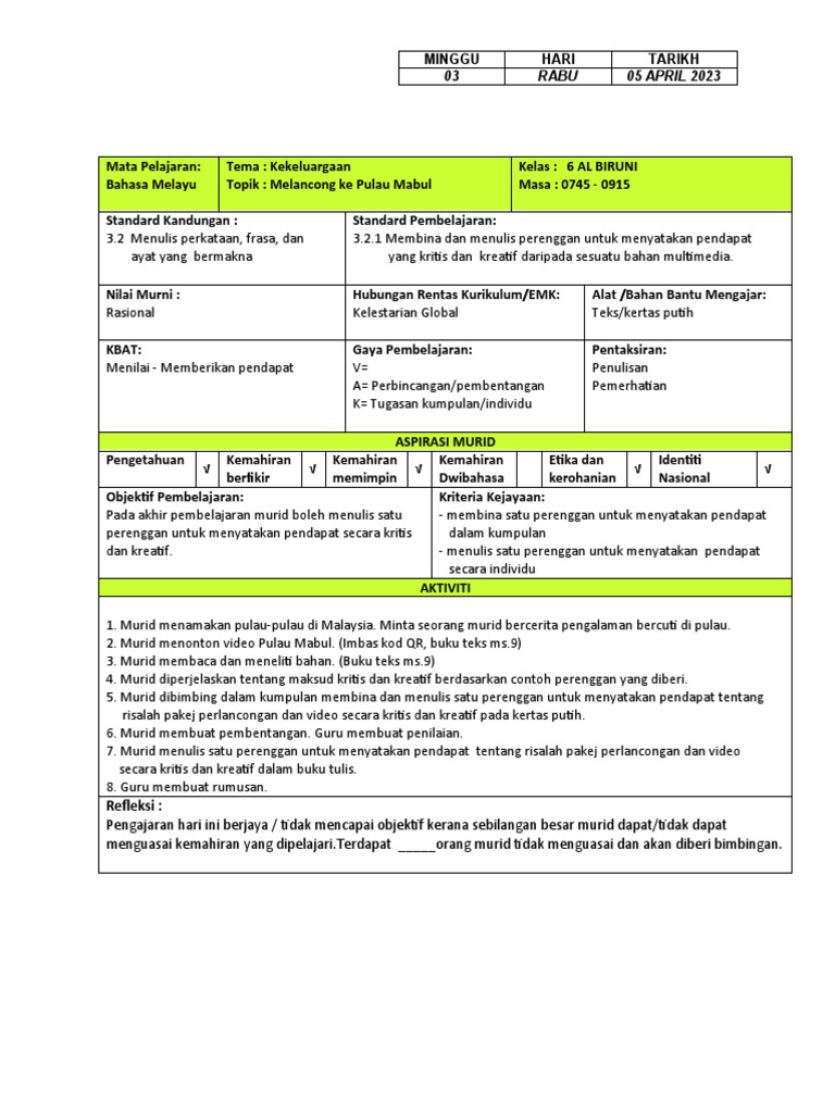 Bahasa Melayu Topik : Melancong ke Pulau Mabul Masa : 0745 - 0915