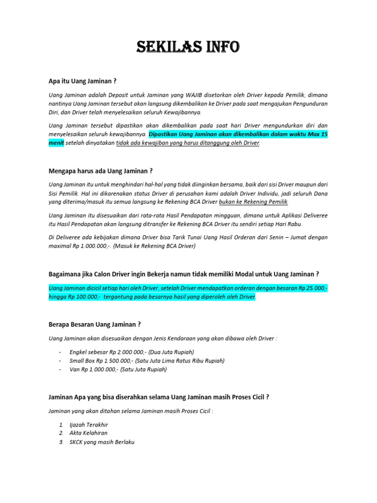 Uang Jaminan itu disesuaikan dari rata-rata Hasil Pendapatan mingguan, dimana untuk Aplikasi Deliveree