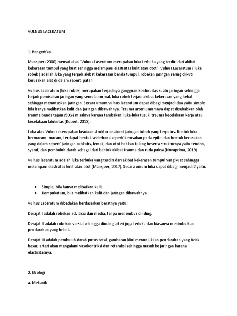 Mansjoer (2000) menyatakan "Vulnus Laseratum merupakan luka terbuka yang terdiri dari akibat