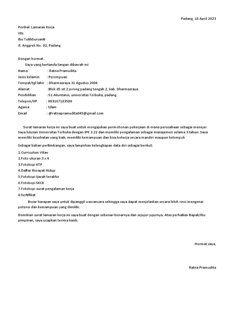 Sebagai bahan pertimbangan, saya lampirkan kelengkapan data diri sebagai berikut: