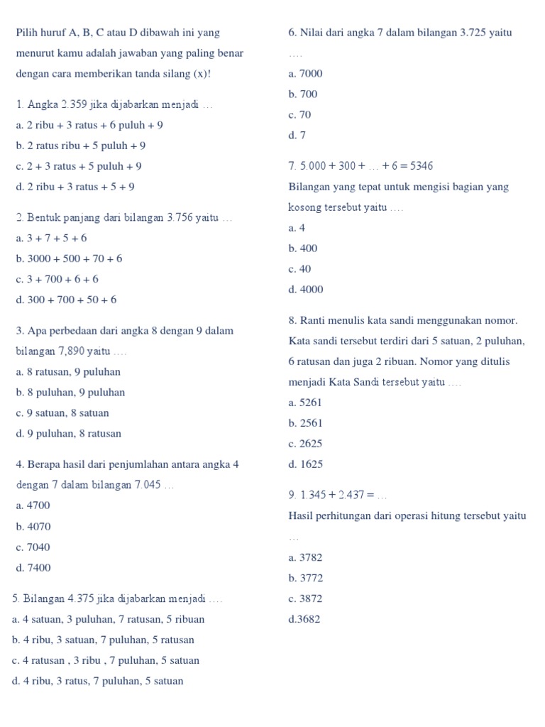 c. 2 + 3 ratus + 5 puluh + 9 7. 5.000 + 300 + … + 6 = 5346