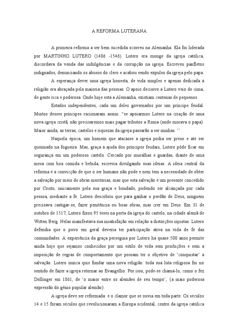 Ela foi liderada por MARTINHO LUTERO (1486 -1546). Lutero era monge da igreja catlica, discordava da venda das indulgncias e da corrupo na igreja. Escreveu panfletos indignados, denunciando os abusos do clero e acabou sendo expulso da igreja pelo papa. A esperana dever uma igreja honesta, de vida simples e apenas dedicada religio era abraada pela maioria das pessoas. O apoio decisivo a Lutero veio de cima, de gente rica e poderosa. Onde hoje est a Alemanha, existiam centenas de pequenos Estados independentes, cada um deles governados por um prncipe feudal. Muitos desses prncipes racionaram assim: se apoiarmos Lutero na criao de uma nova igreja crist, no precisaremos mais pagar tributos a Roma (onde morava o papa). Maior ainda, as terras, castelos e riquezas da igreja passaro a ser minhas. Naquela poca, um homem que atacasse a igreja podia ser preso e at ser queimado na fogueira. Mas, graa ajuda dos prncipes feudais, Lutero pde ficar em segurana em um poderoso castelo. Cercado por muralhas e guardas, diante de uma mesa com boa comida e bebida, escrevia divulgando suas idias. A idia central da reforma a convico de que o ser humano no pode e nem tem a necessidade de obter a salvao por meio de obras meritrias, mas que esta salvao um presente concedido por Cristo, unicamente pela sua graa e bondade, podendo ser alcanada por cada pessoa, mediante a f. Lutero descobriu que para ganhar o perdo de Deus, ningum precisava castigar-se, fazer penitncia ou boas obras, mas crer em Deus. Em 31 de outubro de 1517, Lutero fixou 95 teses na porta da igreja do castelo, na cidade alem de Witten Berg. Nelas manifestava sua insatisfao em relao a distores injustas. Lutero defendia que o povo em geral deveria ter participao ativa na vida de f das comunidades. A experincia da graa perseguia por Lutero h quase 500 anos permite ainda hoje que sejamos conhecidos por um estilo de vida sem proibies e sem a imposio de regras de comportamento que possam ter o objetivo de conquistar a salvao. Lutero nunca quis fundar uma nova religio: toda sua luta religiosa foi no sentido de fazer a igreja retornar ao Evangelho. Por isso, pode-se cham-lo, como o fez Dllinger em 1861, de o maior entre os alemes de seu tempo, {a mais poderosa expresso do gnio popular alemo}. A igreja deve ser reformada: o clamor que se ouvia em toda parte. Os sculos 14 e 15 foram sculos que revolucionaram a Europa ocidental, centro da igreja catlica
