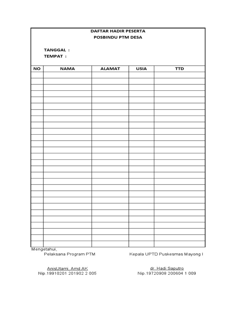 DAFTAR HADIR KADER POSBINDU PTM DESA