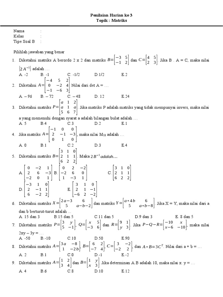 3. Diketahui matriks P= a 1 a . Jika matriks P adalah matriks yang tidak mempunyai invers, maka nilai