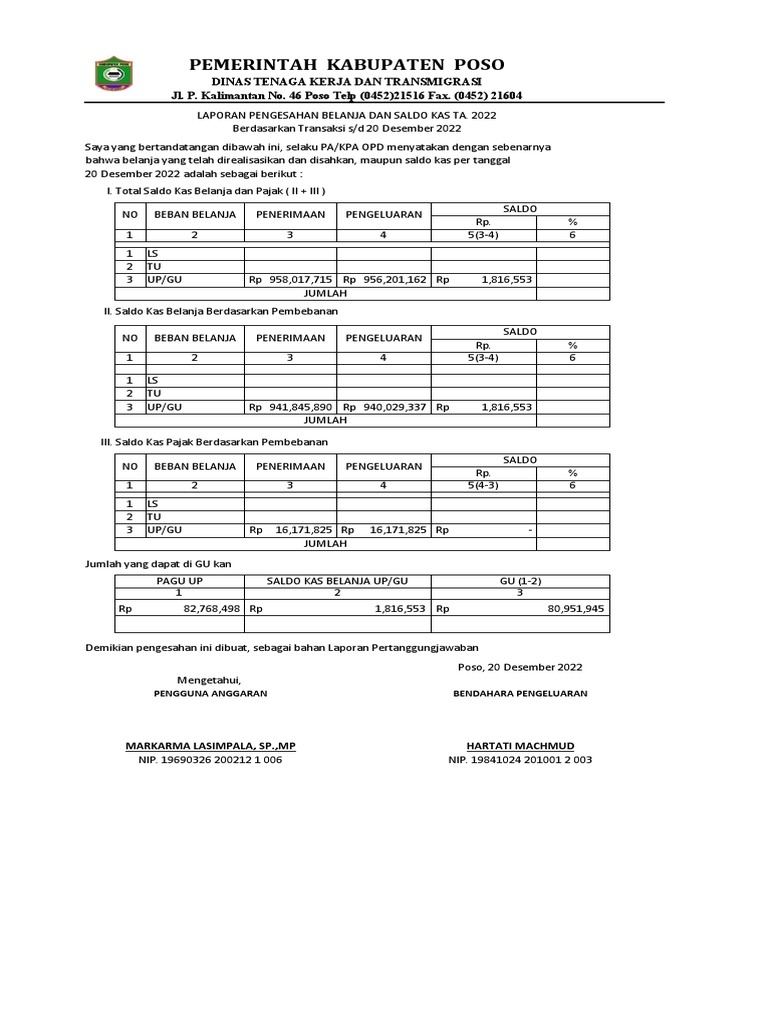 LAPORAN PENGESAHAN BELANJA DAN SALDO KAS TA. 2022