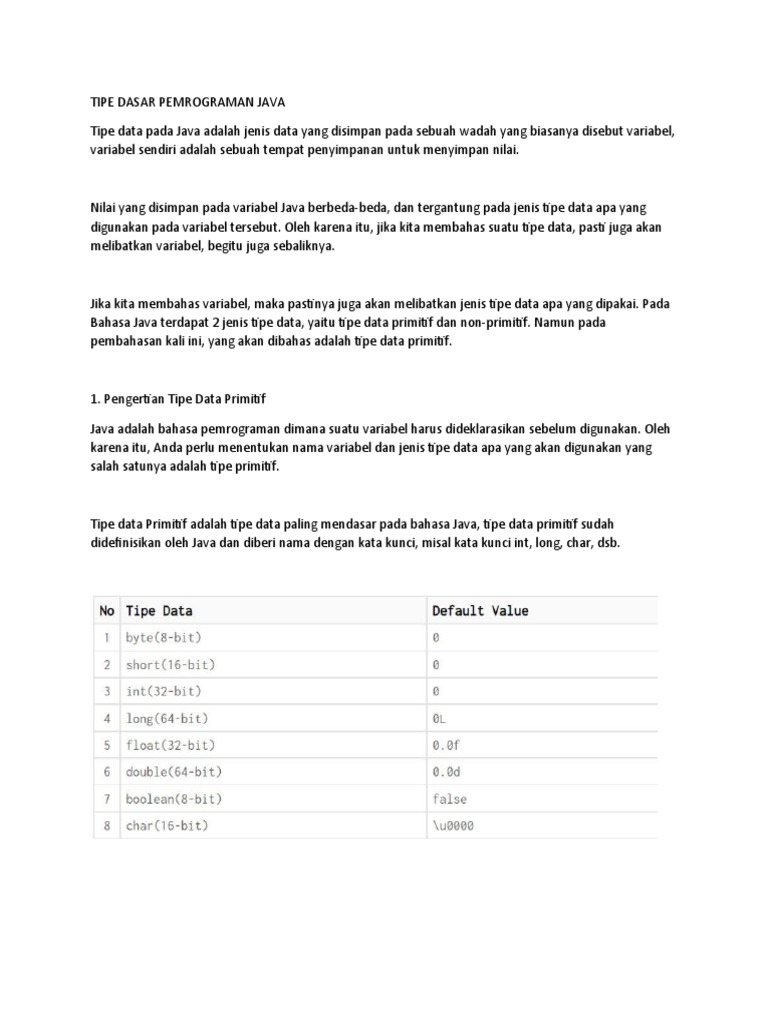 Bahasa Java terdapat 2 jenis tipe data, yaitu tipe data primitif dan non-primitif. Namun pada